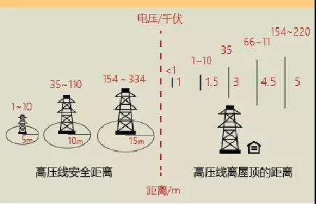 不同電壓等級(jí)的高壓帶電線路所必須保持的安全距離,當(dāng)物體進(jìn)入這些安全距離時(shí),就會(huì)引起放電。根據(jù)《電力設(shè)施保護(hù)條例實(shí)施細(xì)則》對(duì)安全距離的規(guī)定,1千伏以下高壓線的安全距離為4米;1-10千伏高壓線的安全距離為5米;35-110千伏高壓線的安全距離為10米;154-220千伏高壓線的安全距離為15米。
